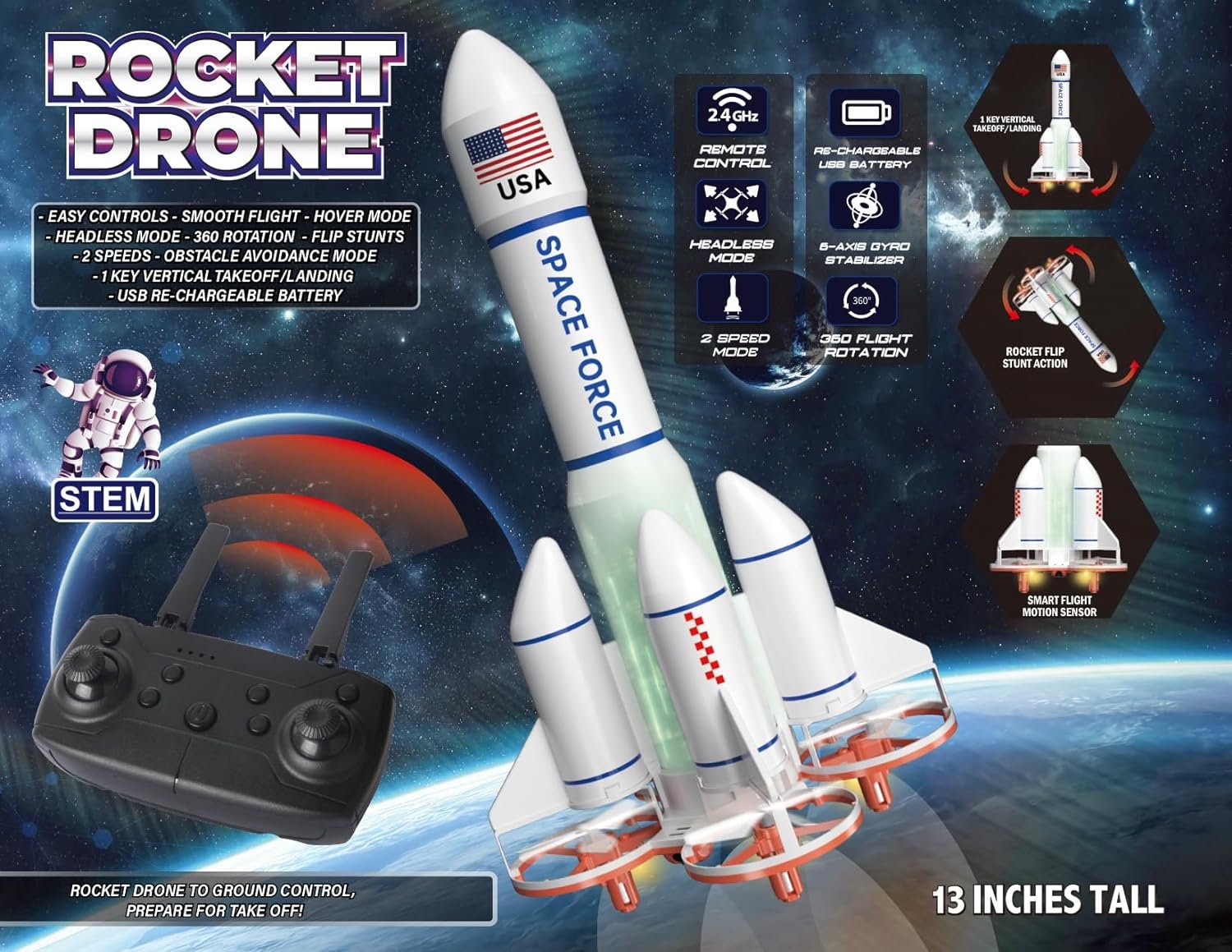 Discover more about the Rocket Drone Space Force Quadcopter with motion control stunts, 2.4G control, for indoor and outdoor flight.